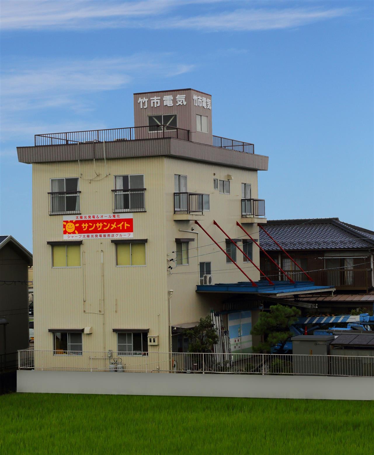 本日は現在の弊社をご紹介します。写真が現在の弊社になります。これまで当社に関わりいただきました皆様に支えられて、鉄骨造3階建ての社屋となりました。以前は3階が寮に成っていましたが現在は寮はありません。竹市電気株式会社は、「電気」を通して社会に貢献し安全で明るい地域と未来を創造して行きます。宜しくお願いいたします。